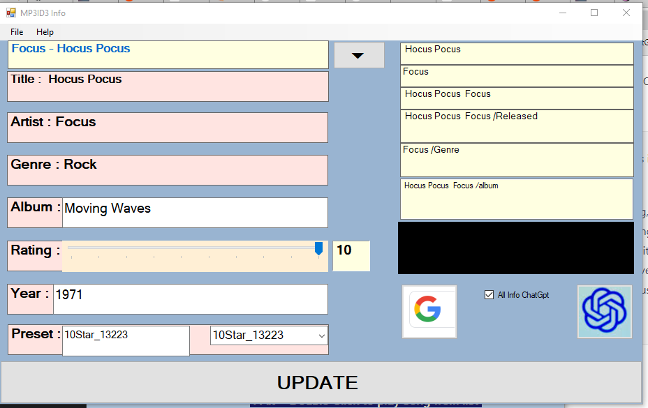 Search for song/band/artist info with Chatgpt or Google